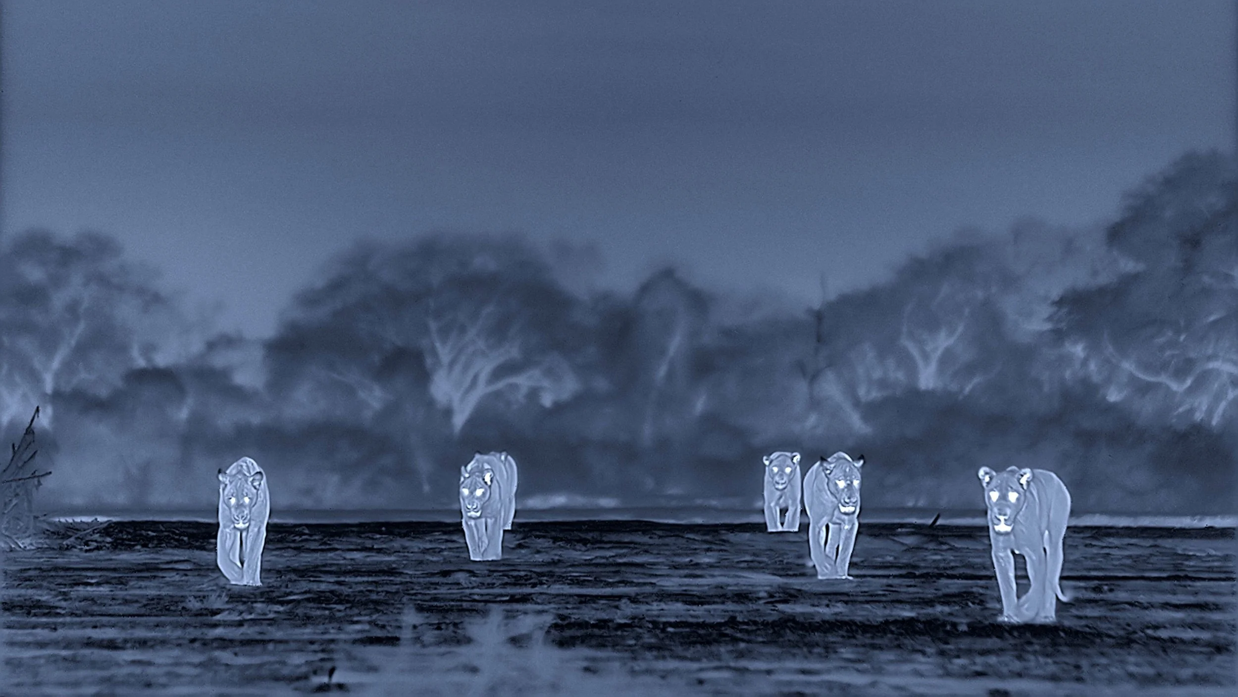 The wild dogs, especially when the cubs first have the ability to experience the wet season is joyful. However, when the buffalo eventually move through, tragedy strikes again. What is interesting here is the more intrinsically embedded these cameras become the more the primality and loss of this animal world becomes abundantly clear especially with individual animals. If we were never here, watching the hierarchy displayed in a protected national park is what nature primally dictates. The lions are of course the top of the food chain but it is so much clearer that they are aggressors, many of the times just to retain dominance. The leopard and dogs kill because they need food but they don't play with it. One image in night vision (the technology now is wonderfully detailed) show the lionesses playing with a crocodile away from its watering hole just for spite. This is also in totally darkness which makes it even more interesting because we can't see what they see. Eventually because the lions get ever more vicious, the wild dogs end up retreating out of the national park when they consider it no longer safe. A lioness herself has cubs but they too are not immune from possible danger from trudging elephants. The animal kingdom continues on but it will be interesting to see what is in store. A-