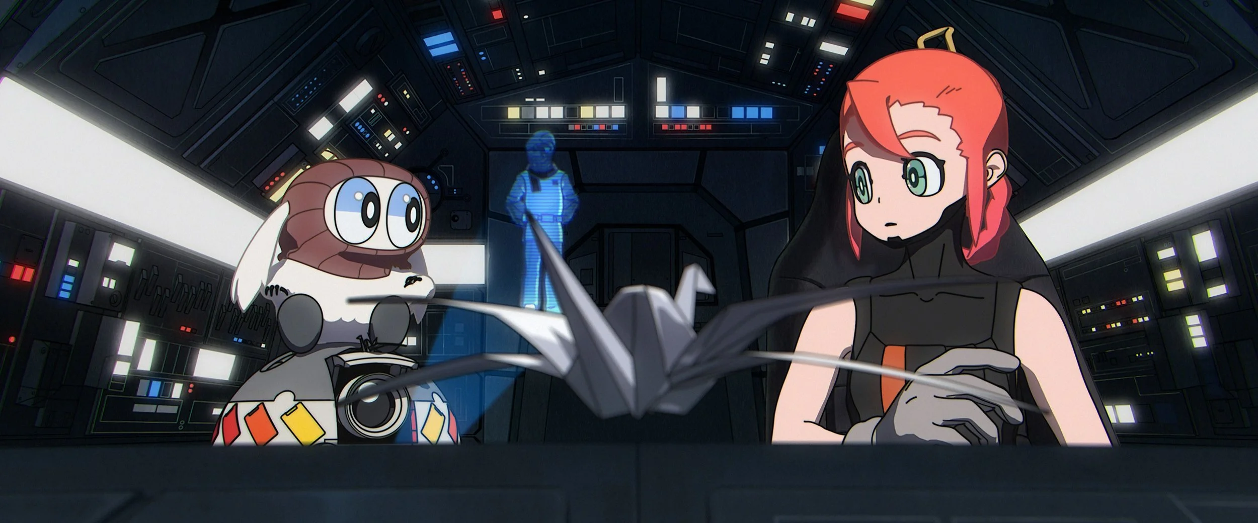 In Ep 3: "The Ninth Jedi: Child Of Hope", the makers explore an interesting and cinematic existential story but one that Production I.G. is always good at. Kara is a girl like Jyn Orso who lost her father. She is left behind in a pursuit (though the life support idea is flimsy). She ends up on an abandoned ship with a service droid serving his master and yet lost in an asteroid field. The episode shows his compassion and her belief in him and ends up being the most emotional of the stories so far. She doesn't want to leave him and yet his sacrifice in one space is breathtaking. A pod plays a role but it is the sense of loss that leaves it open for interpretation as to where Kara might go.